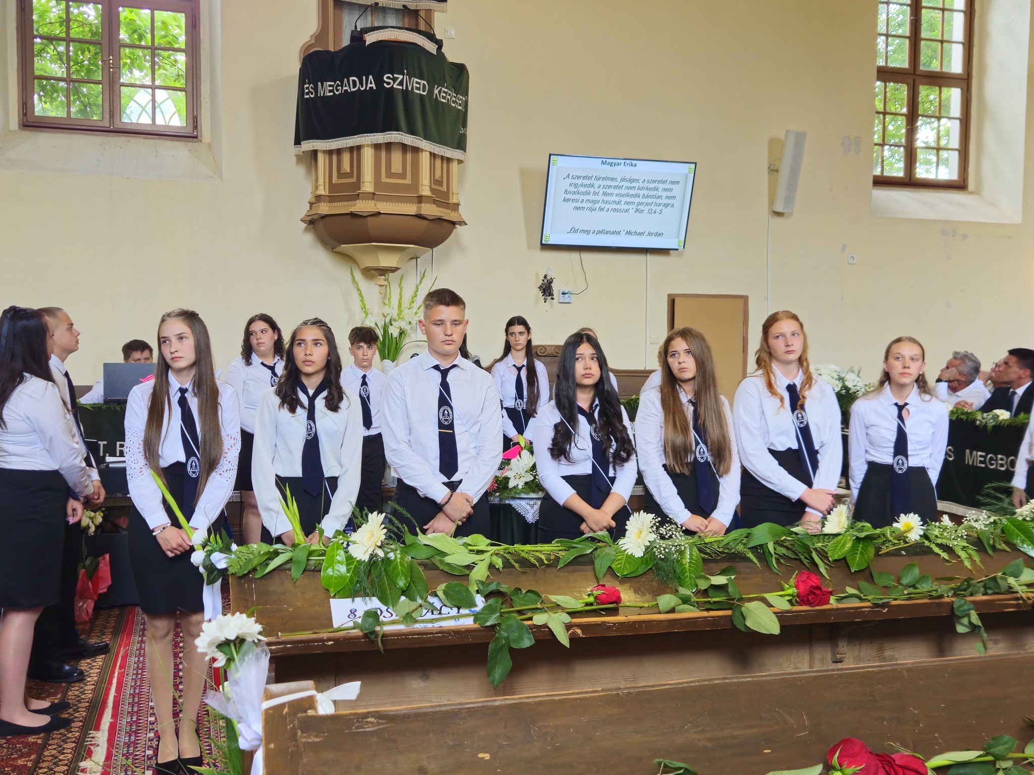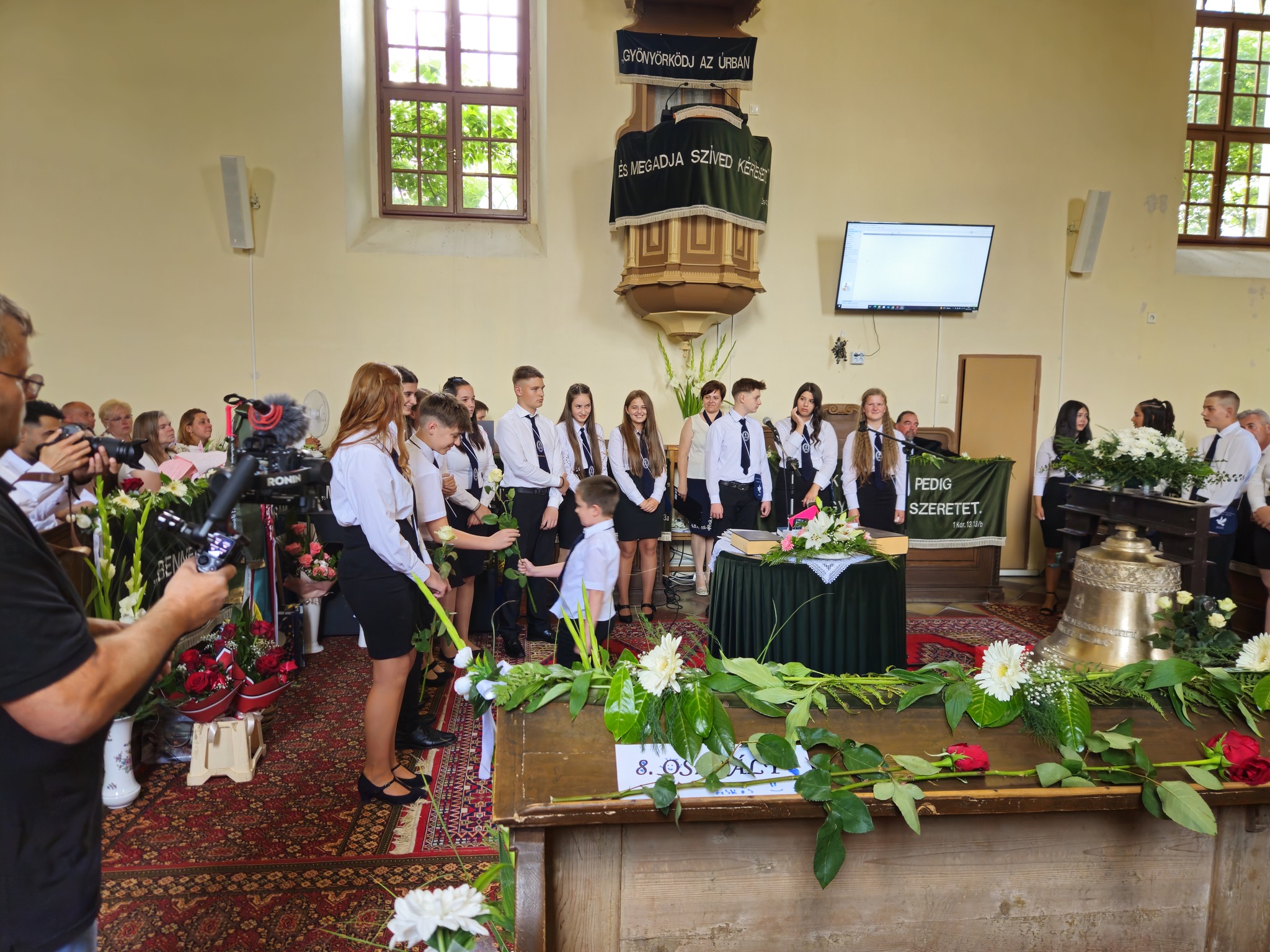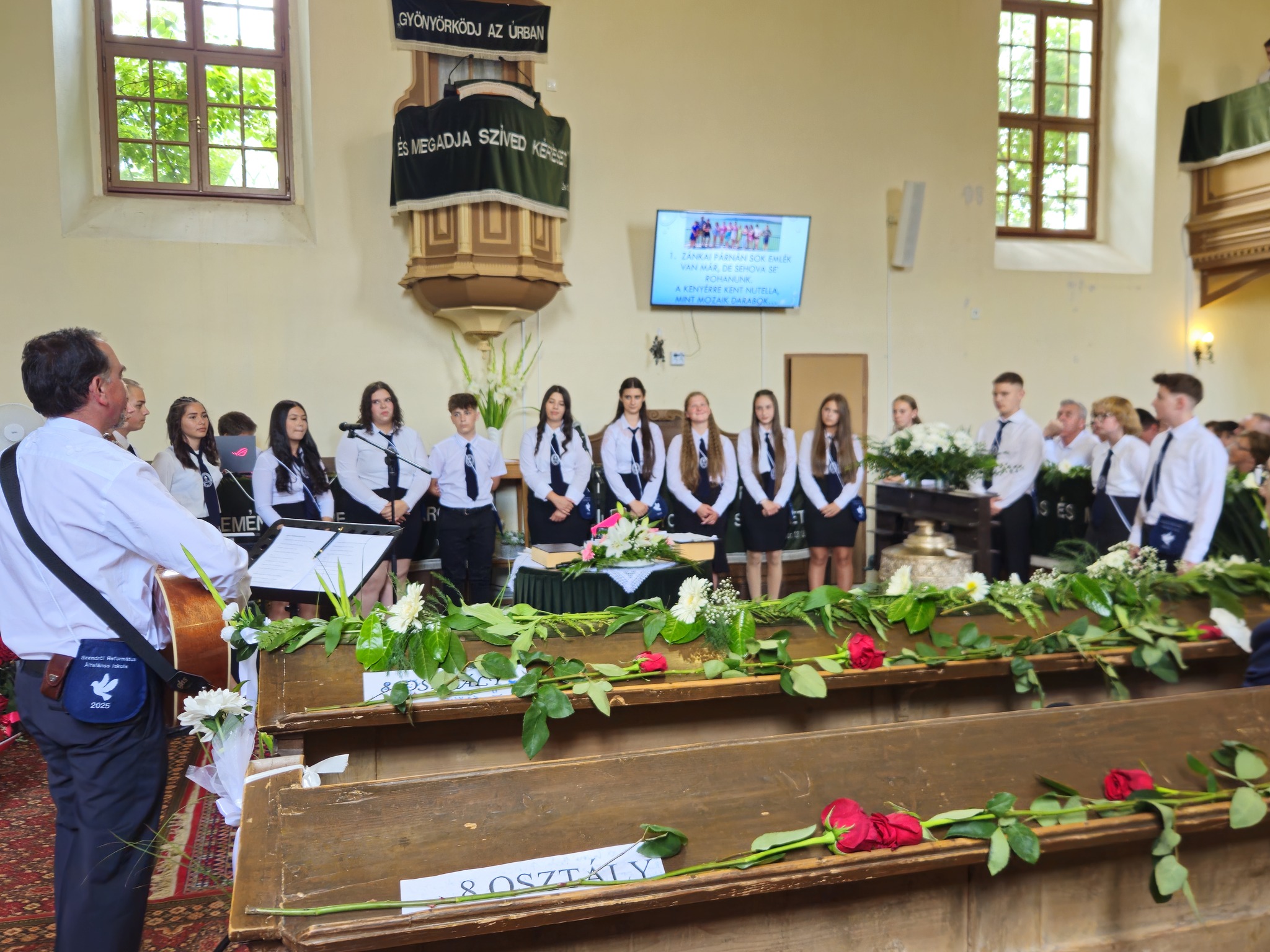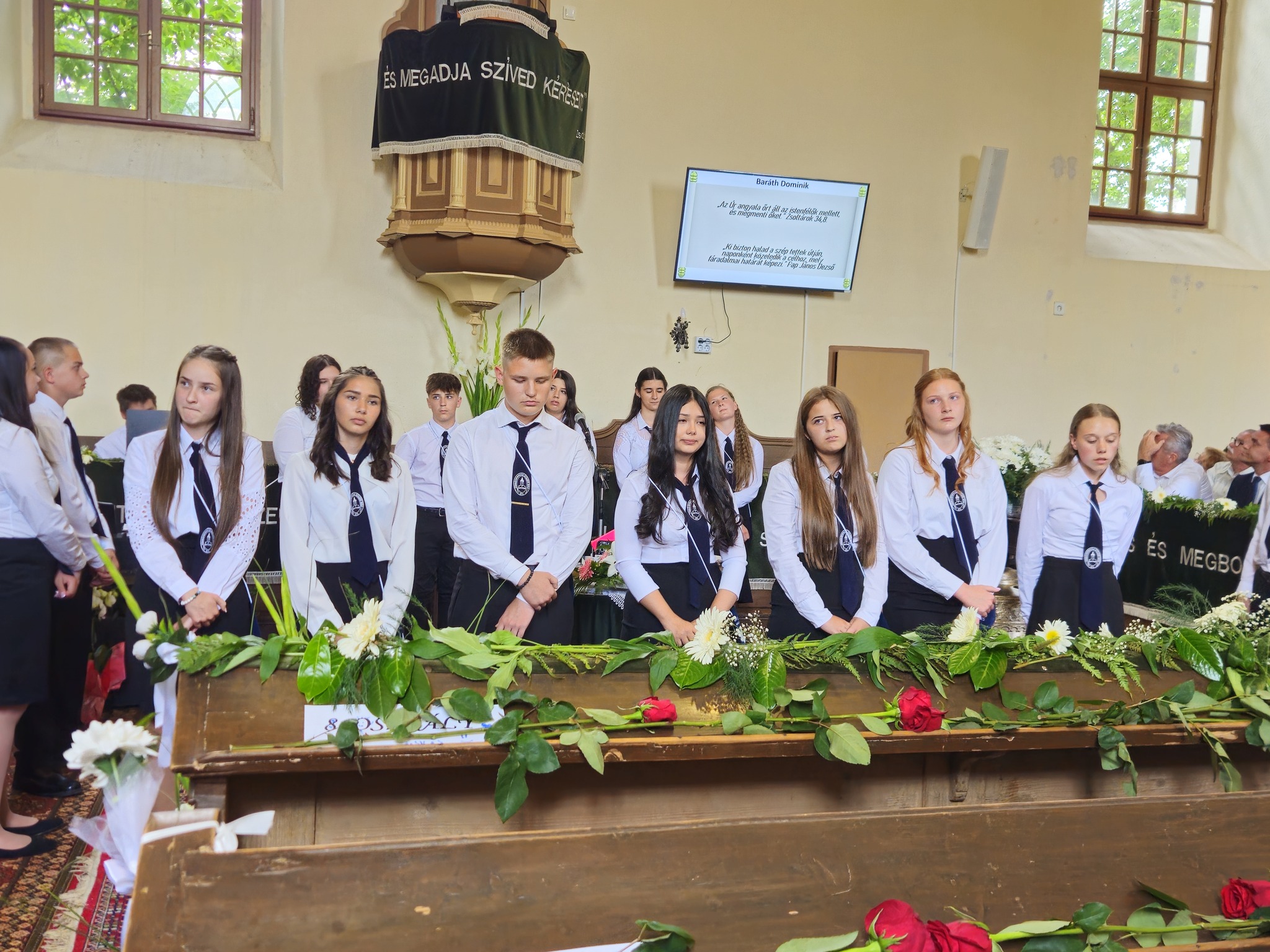 "Mindeddig megsegített minket az Úr!" 1Sámuel 7,12 Újabb évfolyam ballagott iskolánkból a tegnapi napon. Az ünnepi istentiszteleten idén is tele volt a református templom, hiszen egy újabb mérföldkőhöz ért 16 diákunk. Iskolánk zászlójának átadását követően, Nt. Benke András igehirdetését hallgathattunk meg, majd iskolánk főigazgatója, Szegőné Bene Anita, valamint a ballagók osztályfőnöke, Kujan Szabolcs köszönt el a diákoktól. Mindkét személy nagyon szívhez szóló és érzelmekkel teli mondatokkal jelezte a tanulóknak, hogy mennyire fontos és értékes diákjai voltak intézményünknek. Ezt követően a pedagógusok éneke következett, amely ezúttal egy átírt Edda dal volt, mégpedig az Elhagyom a várost című ikonikus sláger. A 7. osztályosok két énekkel, köszönettel és hálatelt szívvel búcsúztatták a ballagókat, tudva azt, hogy a következő tanévben már ők fognak ott állni, ahol most idősebb iskolatársaik álltak. A 8. osztályosok is nagyon megható, olykor vidám pillanatokat szerző, olykor pedig komoly és könnyfacsaró műsort adtak elő, amellyel méltóképpen hagyták maguk mögött általános iskolás éveiket. A diákok nevében Filó Norina búcsúzott a pedagógusoktól, iskolatársaktól és a szülőktől egyaránt, akik ezt követően állhattak ki gyermekük elé, és köszönhették meg mindazt a nyolc esztendőt, amelyet együtt tölthettek iskolánk falai között. Első osztályosaink egy-egy szál virággal köszöntek el az "öreg diákoktól", akik szemlátomást nagyon meghatódva vették át az ajándékokat. A református egyházközség főgondnoka, Ivanics Bálint bölcs gondolatokkal köszönte meg tanulóink elmúlt évi munkáját, amelyet a nevelőtestületi dicséretben részesülő diákok és szülők köszöntése követett. A gyerekek közül, Kormos Edina, Nagy Alexandra, valamint Berceli Tímea, szülők közül pedig, Filó Zsoltné, Ferenczné Fóris Andrea, Ferencz Zoltán, valamint Berceliné Papp Veronika és néhai Berceli István kapta meg ezt a megtiszteltetést. A szülők nevében, Filó Zsoltné mondott búcsúbeszédet, amelyben az iskolavezetésnek és a pedagógusoknak is megköszönte az elvégzett munkát. Továbbá kiegészülve több szülővel, megköszönték mindazok munkáját is, akik a ballagáson vállaltak valamilyen szerepet. Az istentisztelet végén a szokásos prezentáció következett, amelyet most egy videós emlék is kiegészített. Köszönjük mindenkinek, akik eljöttek! Ballagó diákjainknak pedig sok sikert és Isten gazdag áldását kívánjuk további életükre! Visszavárunk titeket!