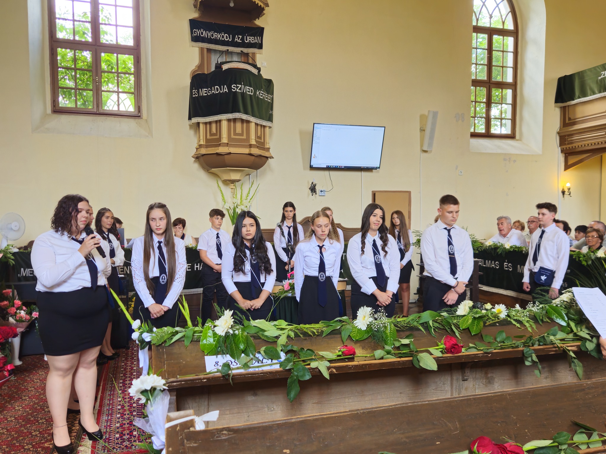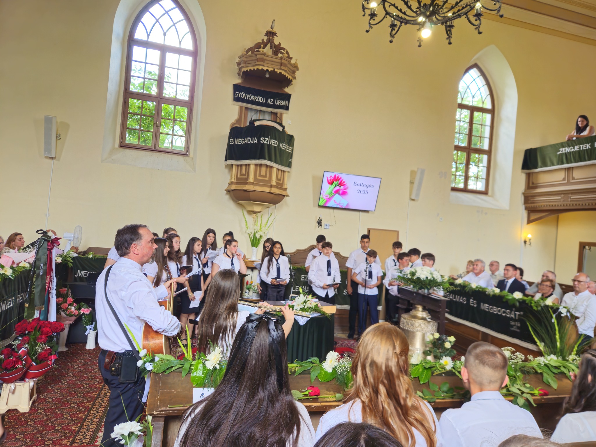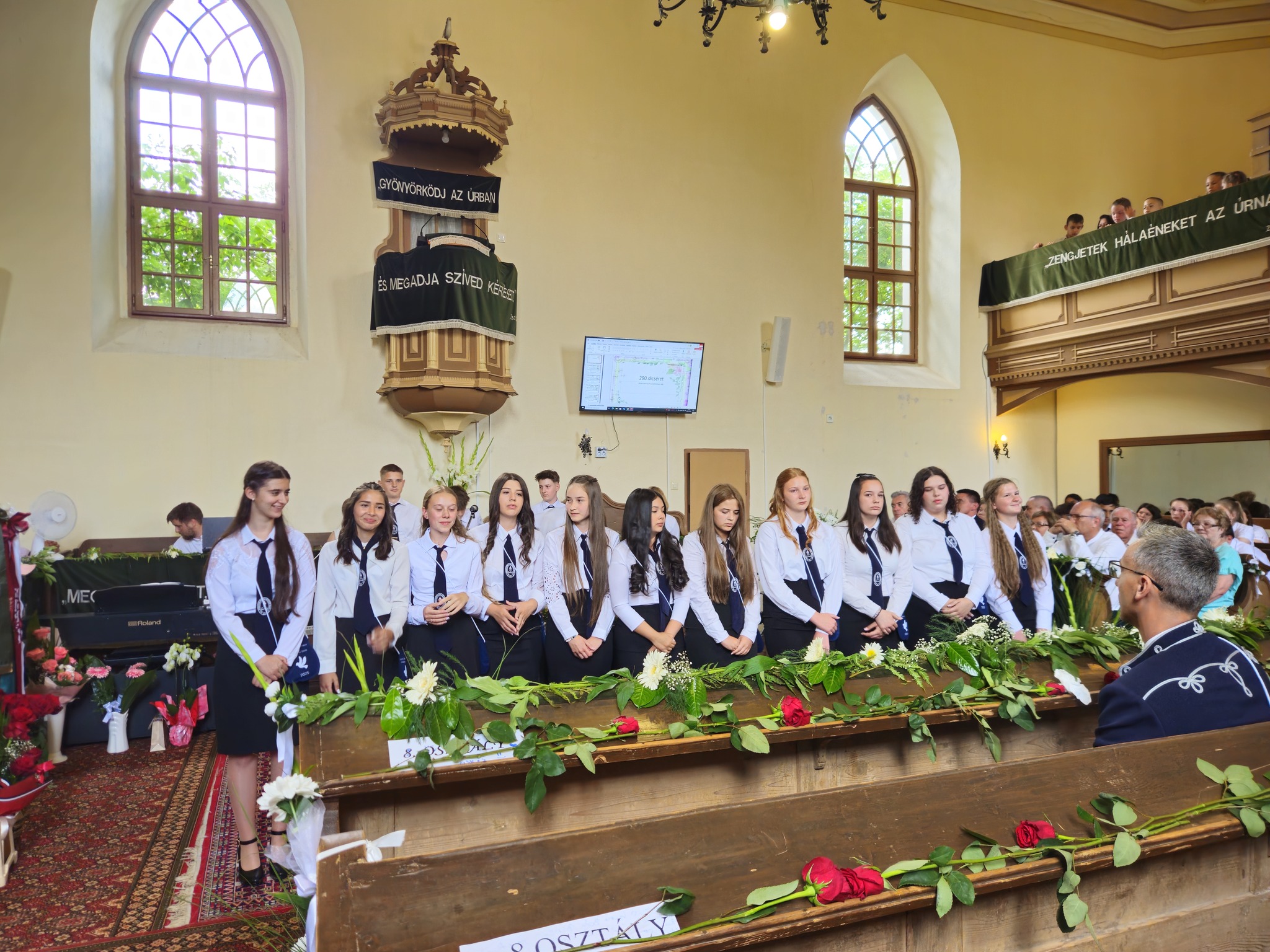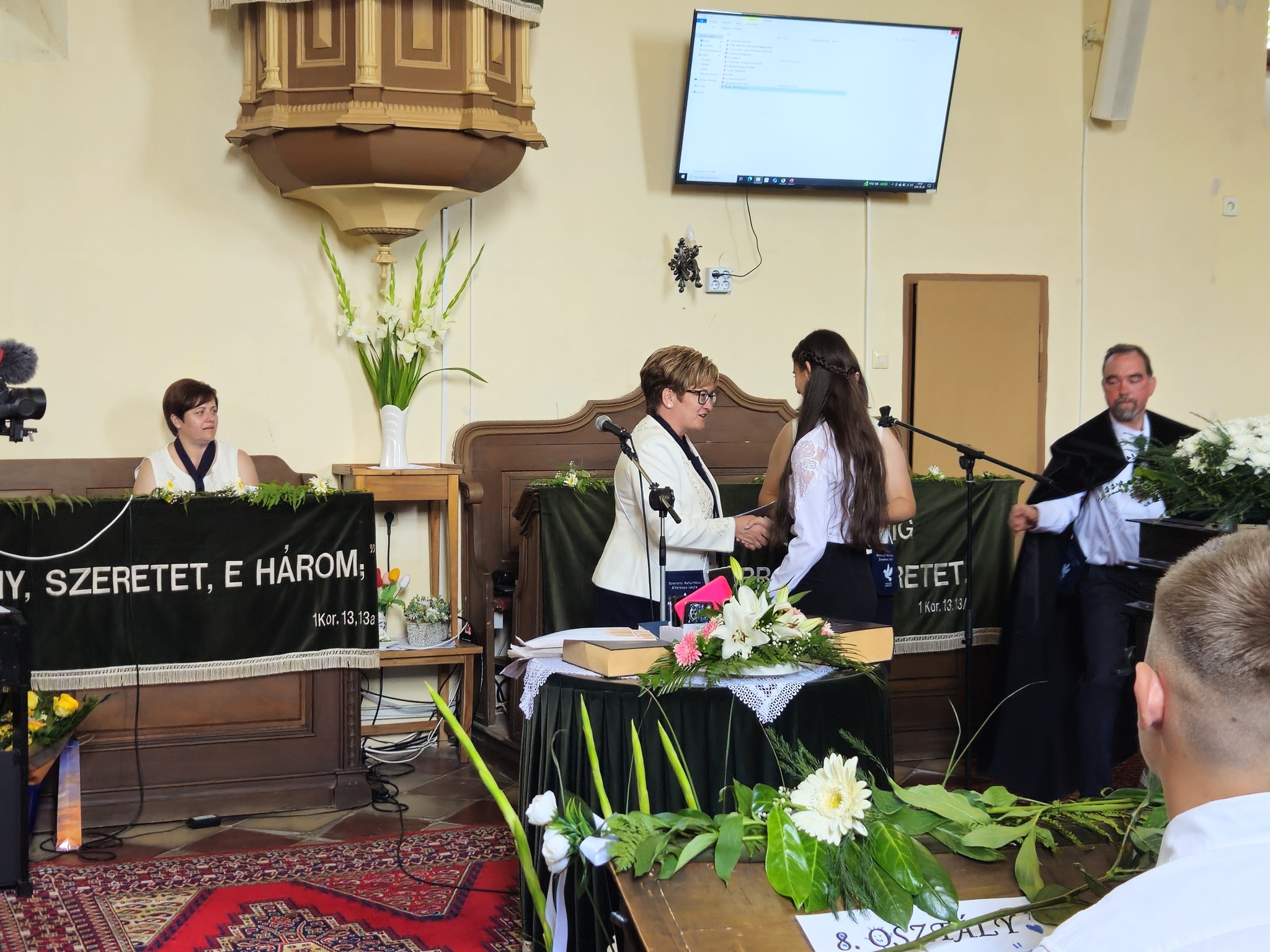 "Mindeddig megsegített minket az Úr!" 1Sámuel 7,12 Újabb évfolyam ballagott iskolánkból a tegnapi napon. Az ünnepi istentiszteleten idén is tele volt a református templom, hiszen egy újabb mérföldkőhöz ért 16 diákunk. Iskolánk zászlójának átadását követően, Nt. Benke András igehirdetését hallgathattunk meg, majd iskolánk főigazgatója, Szegőné Bene Anita, valamint a ballagók osztályfőnöke, Kujan Szabolcs köszönt el a diákoktól. Mindkét személy nagyon szívhez szóló és érzelmekkel teli mondatokkal jelezte a tanulóknak, hogy mennyire fontos és értékes diákjai voltak intézményünknek. Ezt követően a pedagógusok éneke következett, amely ezúttal egy átírt Edda dal volt, mégpedig az Elhagyom a várost című ikonikus sláger. A 7. osztályosok két énekkel, köszönettel és hálatelt szívvel búcsúztatták a ballagókat, tudva azt, hogy a következő tanévben már ők fognak ott állni, ahol most idősebb iskolatársaik álltak. A 8. osztályosok is nagyon megható, olykor vidám pillanatokat szerző, olykor pedig komoly és könnyfacsaró műsort adtak elő, amellyel méltóképpen hagyták maguk mögött általános iskolás éveiket. A diákok nevében Filó Norina búcsúzott a pedagógusoktól, iskolatársaktól és a szülőktől egyaránt, akik ezt követően állhattak ki gyermekük elé, és köszönhették meg mindazt a nyolc esztendőt, amelyet együtt tölthettek iskolánk falai között. Első osztályosaink egy-egy szál virággal köszöntek el az "öreg diákoktól", akik szemlátomást nagyon meghatódva vették át az ajándékokat. A református egyházközség főgondnoka, Ivanics Bálint bölcs gondolatokkal köszönte meg tanulóink elmúlt évi munkáját, amelyet a nevelőtestületi dicséretben részesülő diákok és szülők köszöntése követett. A gyerekek közül, Kormos Edina, Nagy Alexandra, valamint Berceli Tímea, szülők közül pedig, Filó Zsoltné, Ferenczné Fóris Andrea, Ferencz Zoltán, valamint Berceliné Papp Veronika és néhai Berceli István kapta meg ezt a megtiszteltetést. A szülők nevében, Filó Zsoltné mondott búcsúbeszédet, amelyben az iskolavezetésnek és a pedagógusoknak is megköszönte az elvégzett munkát. Továbbá kiegészülve több szülővel, megköszönték mindazok munkáját is, akik a ballagáson vállaltak valamilyen szerepet. Az istentisztelet végén a szokásos prezentáció következett, amelyet most egy videós emlék is kiegészített. Köszönjük mindenkinek, akik eljöttek! Ballagó diákjainknak pedig sok sikert és Isten gazdag áldását kívánjuk további életükre! Visszavárunk titeket!