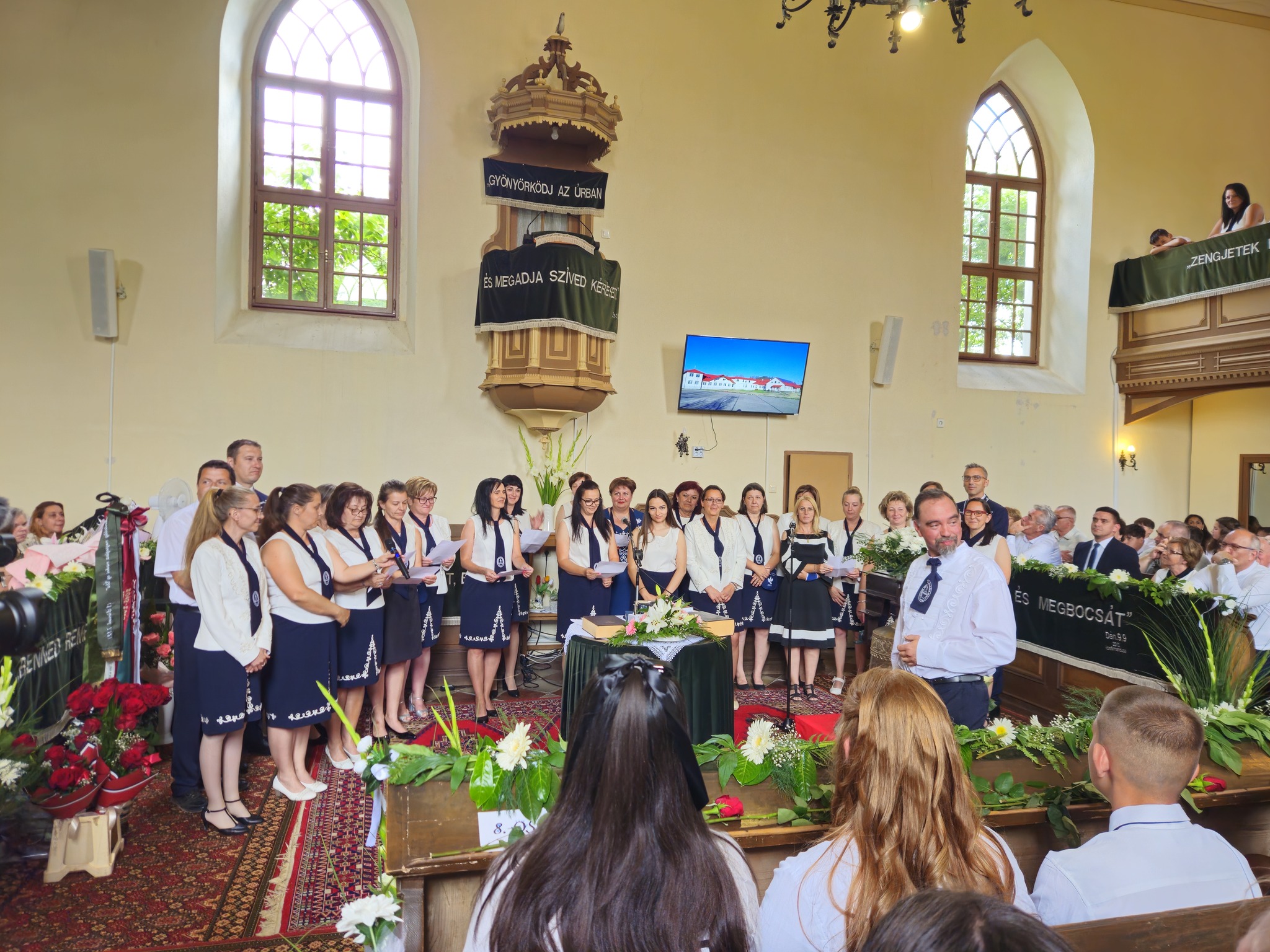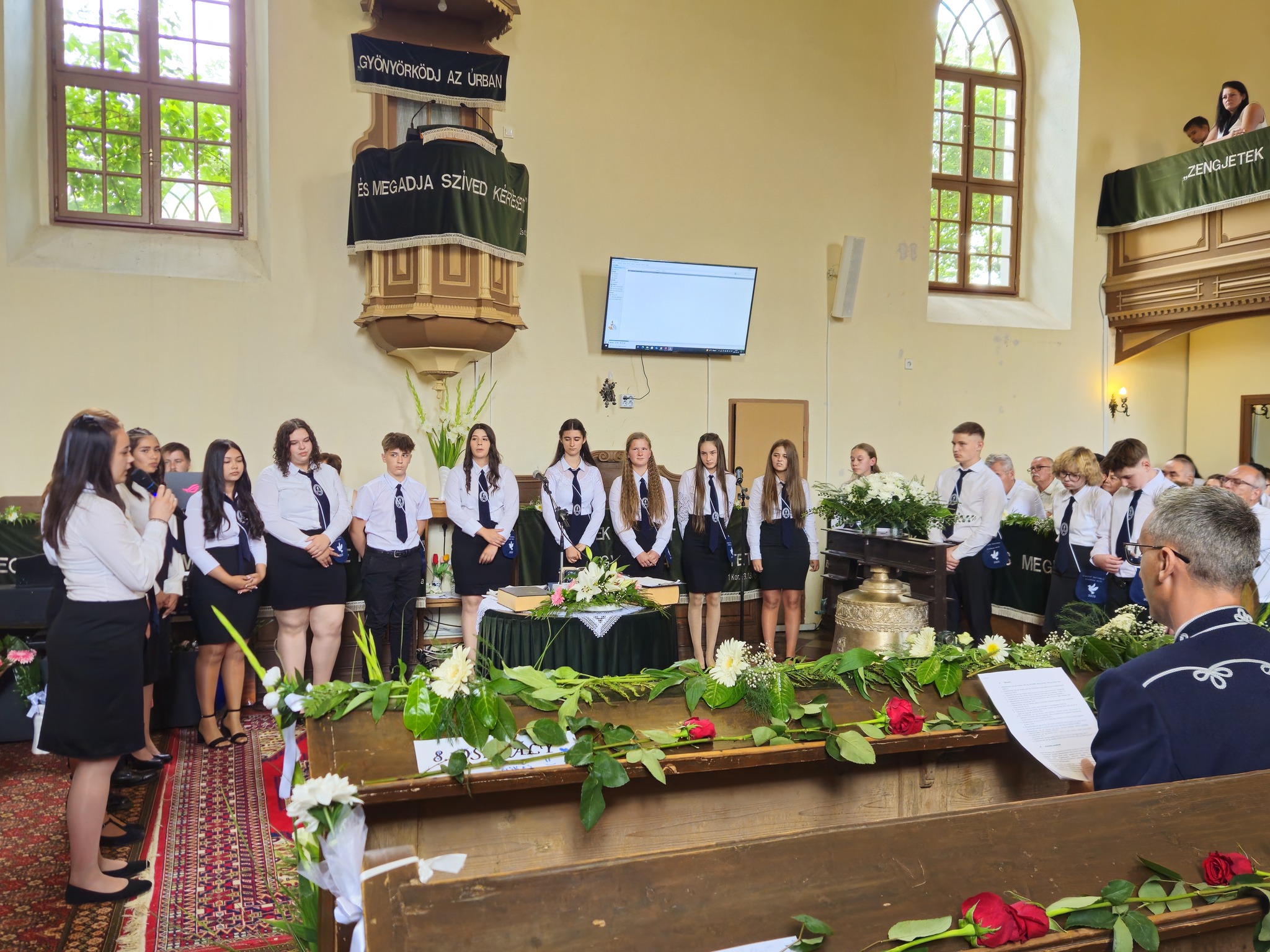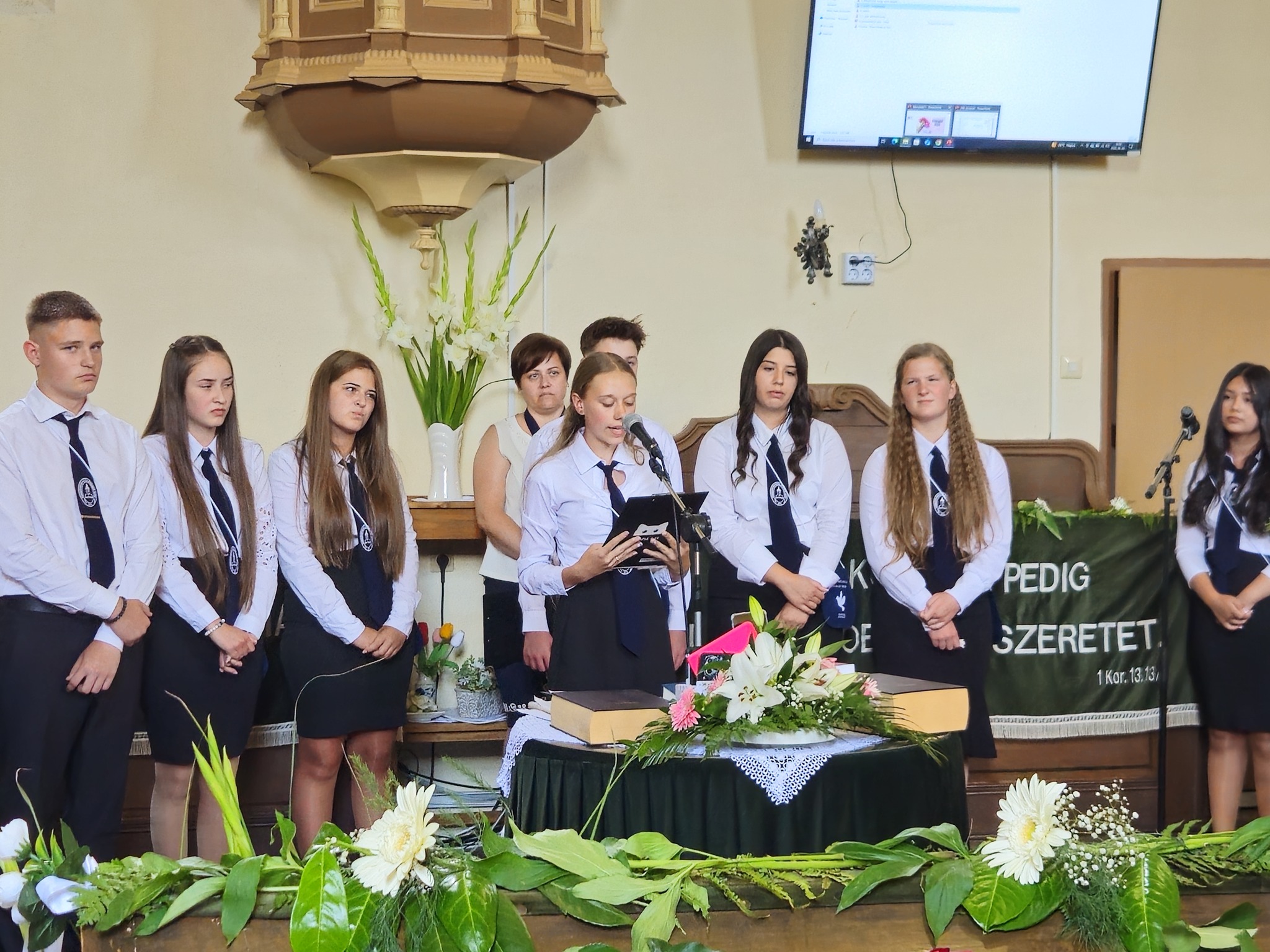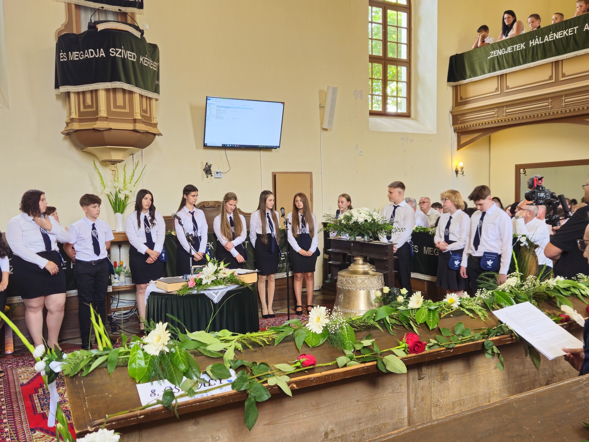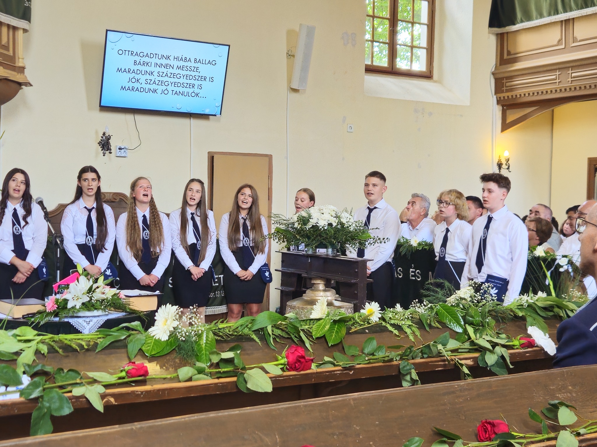"Mindeddig megsegített minket az Úr!" 1Sámuel 7,12 Újabb évfolyam ballagott iskolánkból a tegnapi napon. Az ünnepi istentiszteleten idén is tele volt a református templom, hiszen egy újabb mérföldkőhöz ért 16 diákunk. Iskolánk zászlójának átadását követően, Nt. Benke András igehirdetését hallgathattunk meg, majd iskolánk főigazgatója, Szegőné Bene Anita, valamint a ballagók osztályfőnöke, Kujan Szabolcs köszönt el a diákoktól. Mindkét személy nagyon szívhez szóló és érzelmekkel teli mondatokkal jelezte a tanulóknak, hogy mennyire fontos és értékes diákjai voltak intézményünknek. Ezt követően a pedagógusok éneke következett, amely ezúttal egy átírt Edda dal volt, mégpedig az Elhagyom a várost című ikonikus sláger. A 7. osztályosok két énekkel, köszönettel és hálatelt szívvel búcsúztatták a ballagókat, tudva azt, hogy a következő tanévben már ők fognak ott állni, ahol most idősebb iskolatársaik álltak. A 8. osztályosok is nagyon megható, olykor vidám pillanatokat szerző, olykor pedig komoly és könnyfacsaró műsort adtak elő, amellyel méltóképpen hagyták maguk mögött általános iskolás éveiket. A diákok nevében Filó Norina búcsúzott a pedagógusoktól, iskolatársaktól és a szülőktől egyaránt, akik ezt követően állhattak ki gyermekük elé, és köszönhették meg mindazt a nyolc esztendőt, amelyet együtt tölthettek iskolánk falai között. Első osztályosaink egy-egy szál virággal köszöntek el az "öreg diákoktól", akik szemlátomást nagyon meghatódva vették át az ajándékokat. A református egyházközség főgondnoka, Ivanics Bálint bölcs gondolatokkal köszönte meg tanulóink elmúlt évi munkáját, amelyet a nevelőtestületi dicséretben részesülő diákok és szülők köszöntése követett. A gyerekek közül, Kormos Edina, Nagy Alexandra, valamint Berceli Tímea, szülők közül pedig, Filó Zsoltné, Ferenczné Fóris Andrea, Ferencz Zoltán, valamint Berceliné Papp Veronika és néhai Berceli István kapta meg ezt a megtiszteltetést. A szülők nevében, Filó Zsoltné mondott búcsúbeszédet, amelyben az iskolavezetésnek és a pedagógusoknak is megköszönte az elvégzett munkát. Továbbá kiegészülve több szülővel, megköszönték mindazok munkáját is, akik a ballagáson vállaltak valamilyen szerepet. Az istentisztelet végén a szokásos prezentáció következett, amelyet most egy videós emlék is kiegészített. Köszönjük mindenkinek, akik eljöttek! Ballagó diákjainknak pedig sok sikert és Isten gazdag áldását kívánjuk további életükre! Visszavárunk titeket!