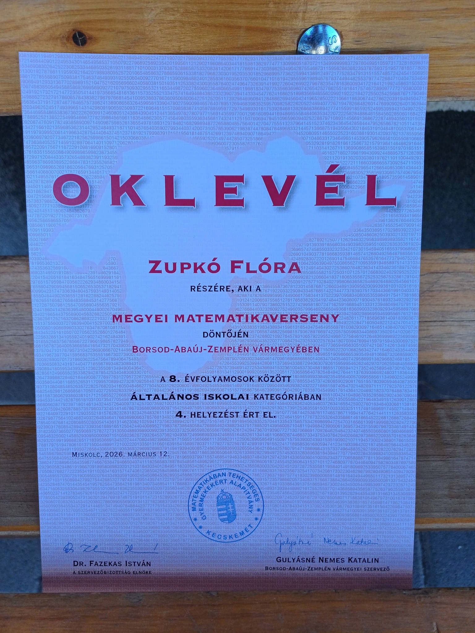 "...az Úr építésre adott, s nem rombolásra.” Pál 2Korinthus 13,10 A Megyei Matematika Verseny döntőjében "általános iskola" kategóriában 4. helyezést ért el Zupkó Flóra, 8. osztályos diákunk! Gratulálunk tanulónknak és felkészítő tanáruknak egyaránt!