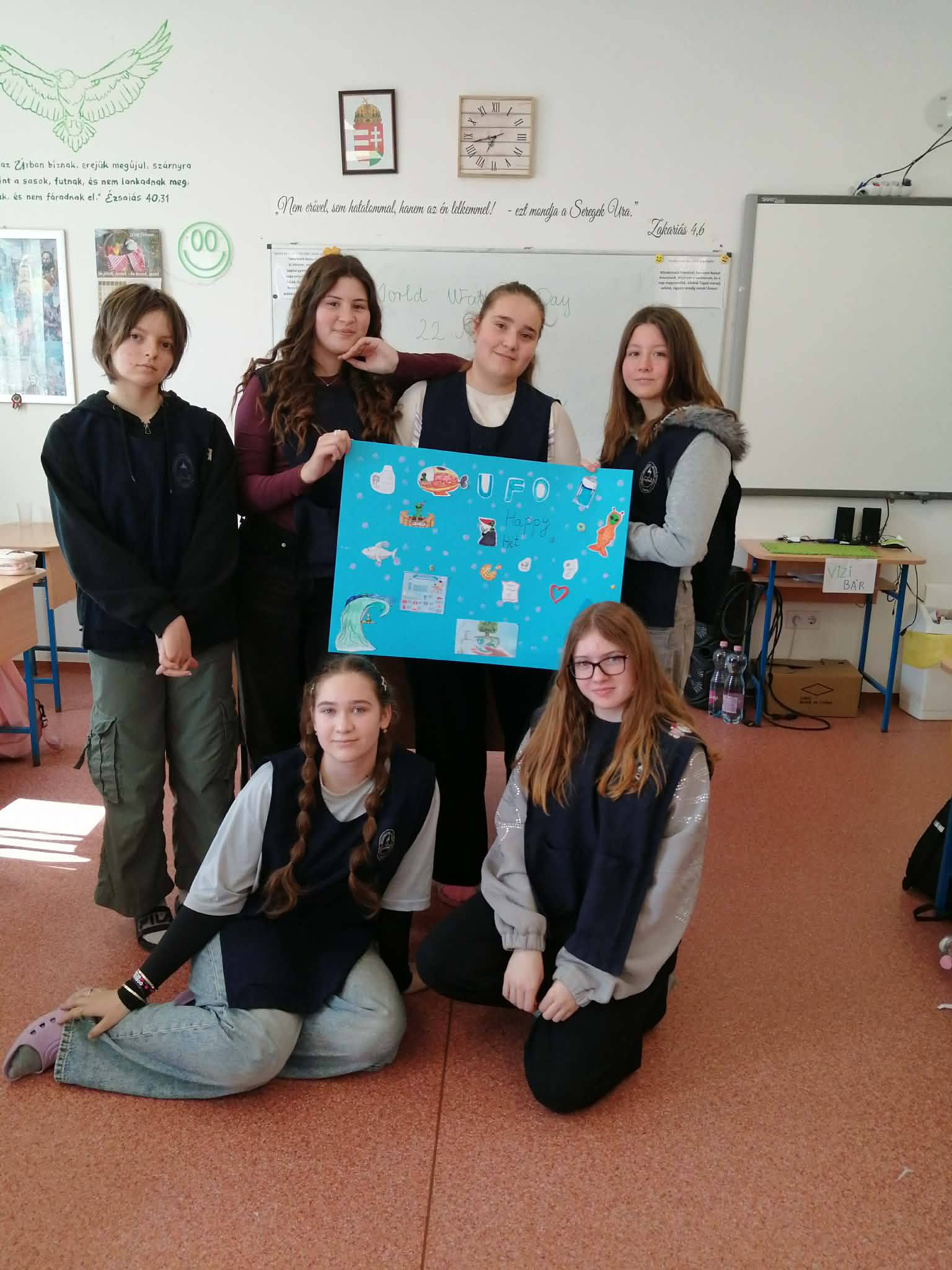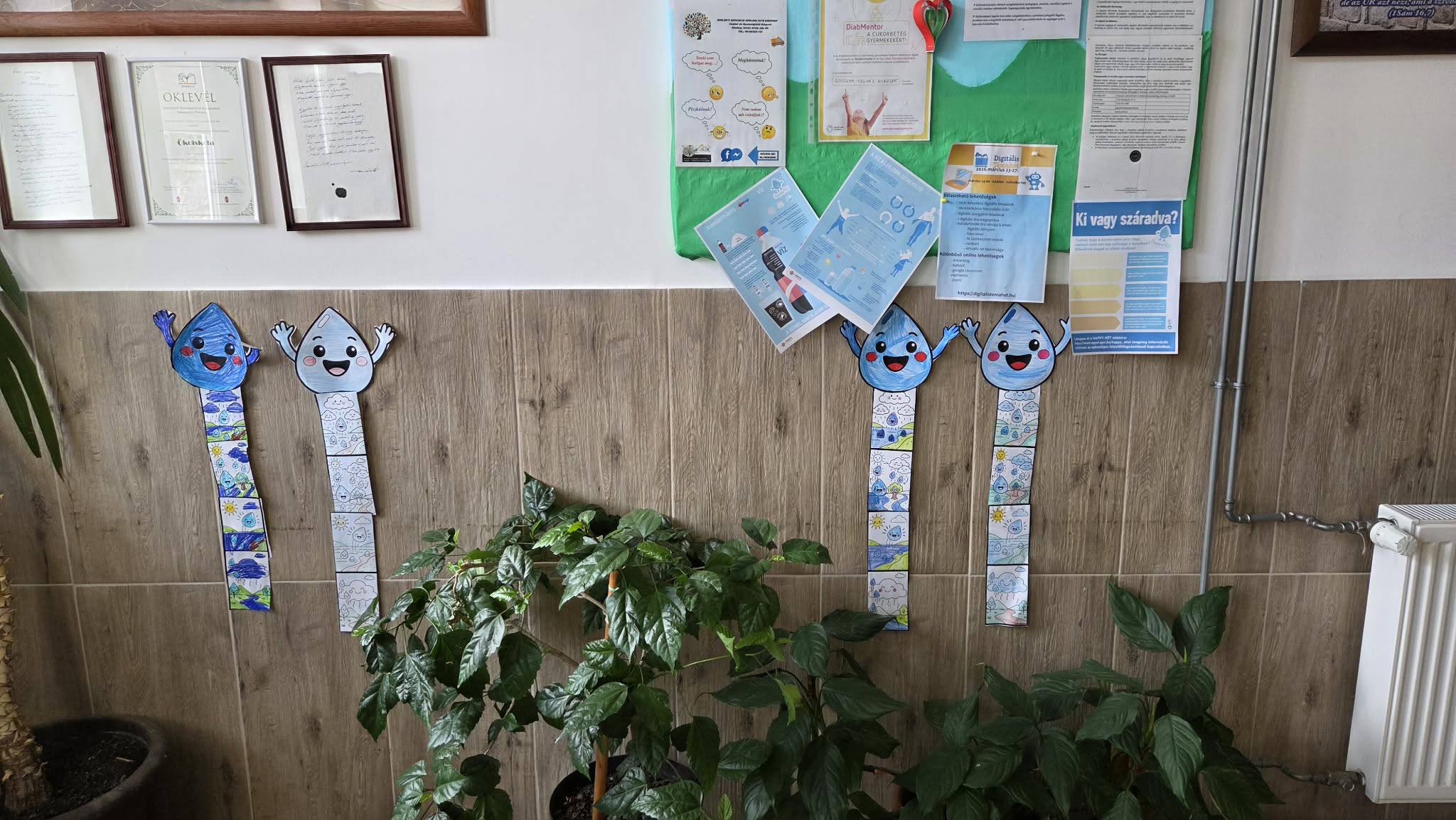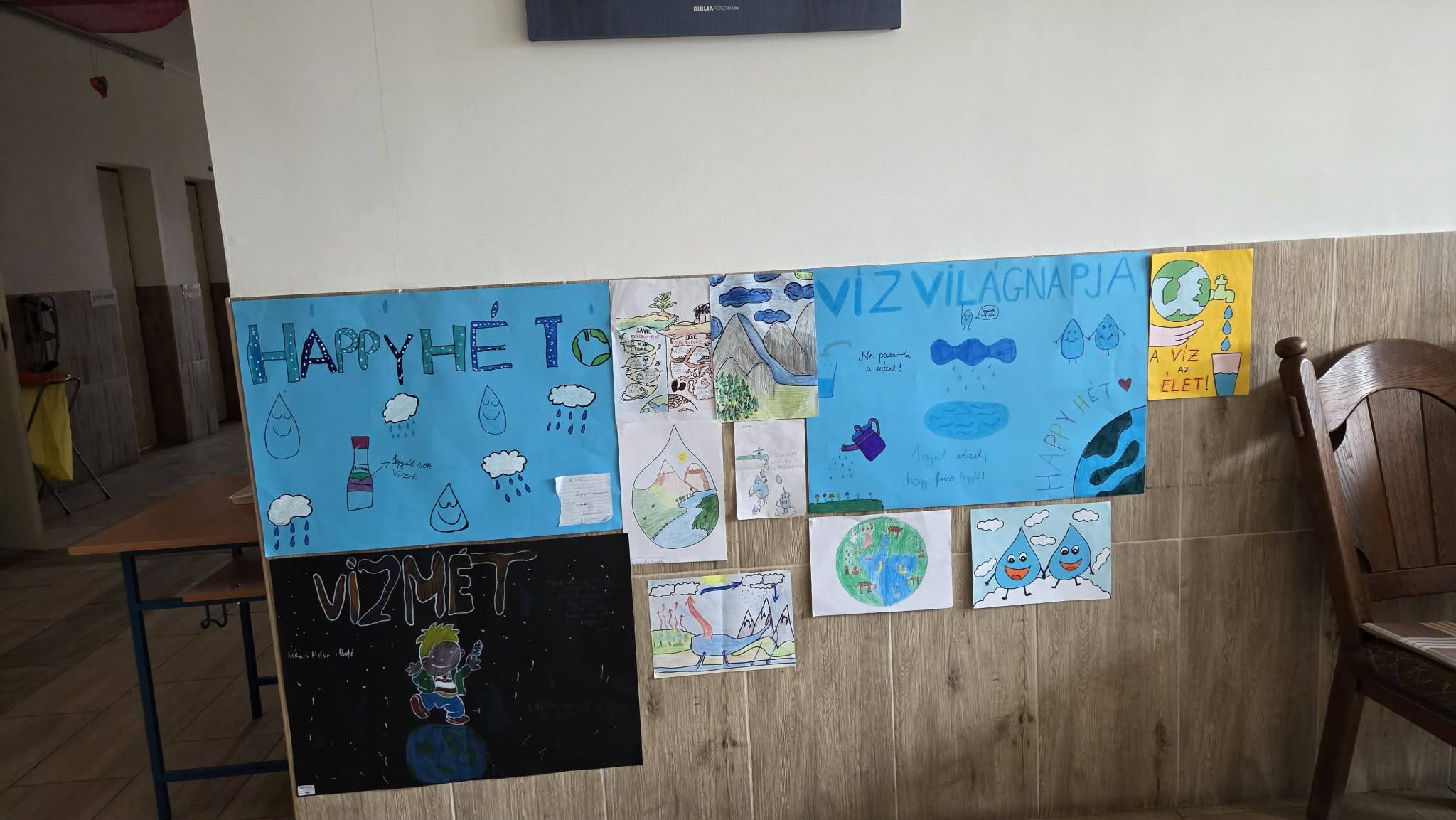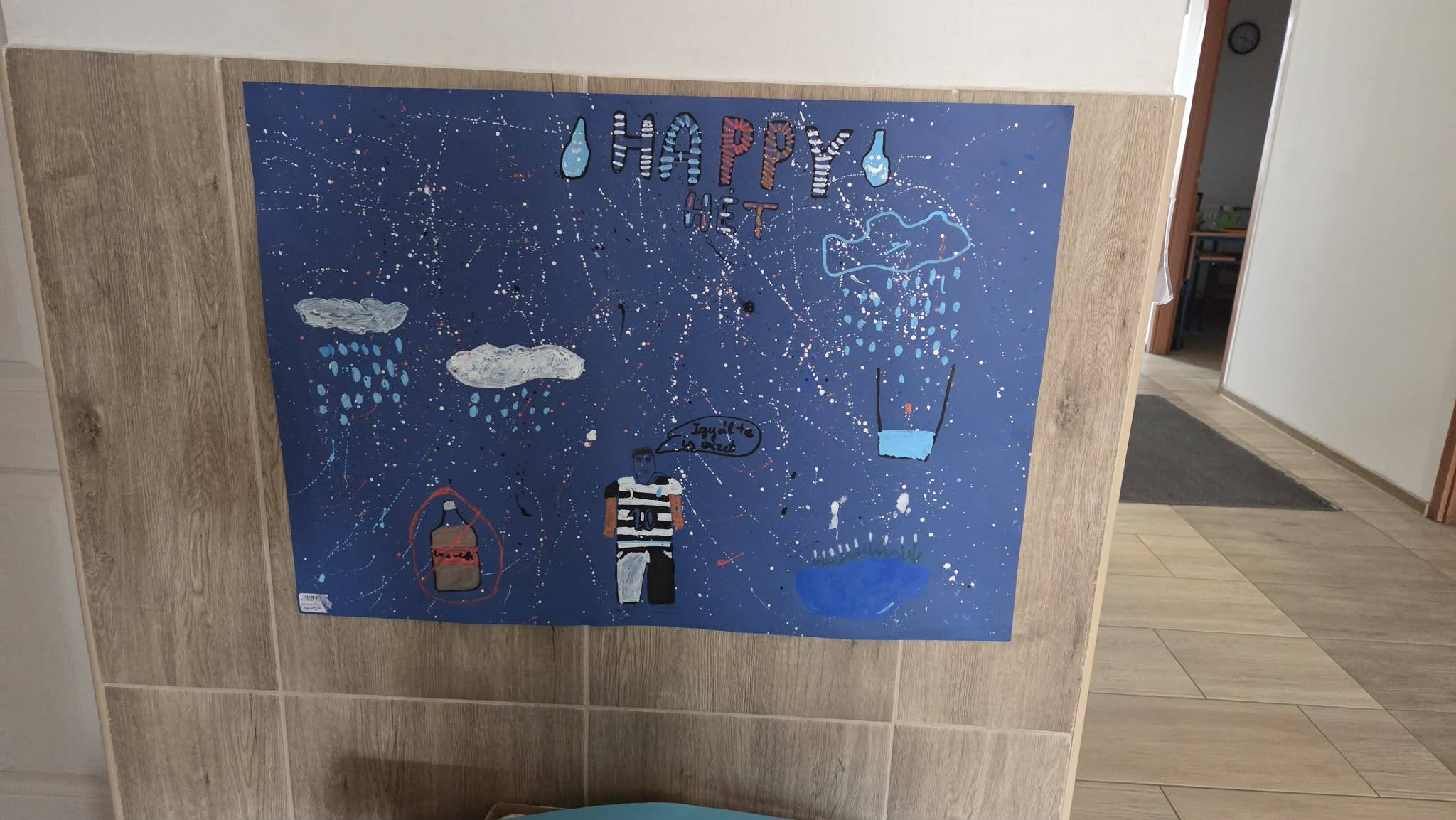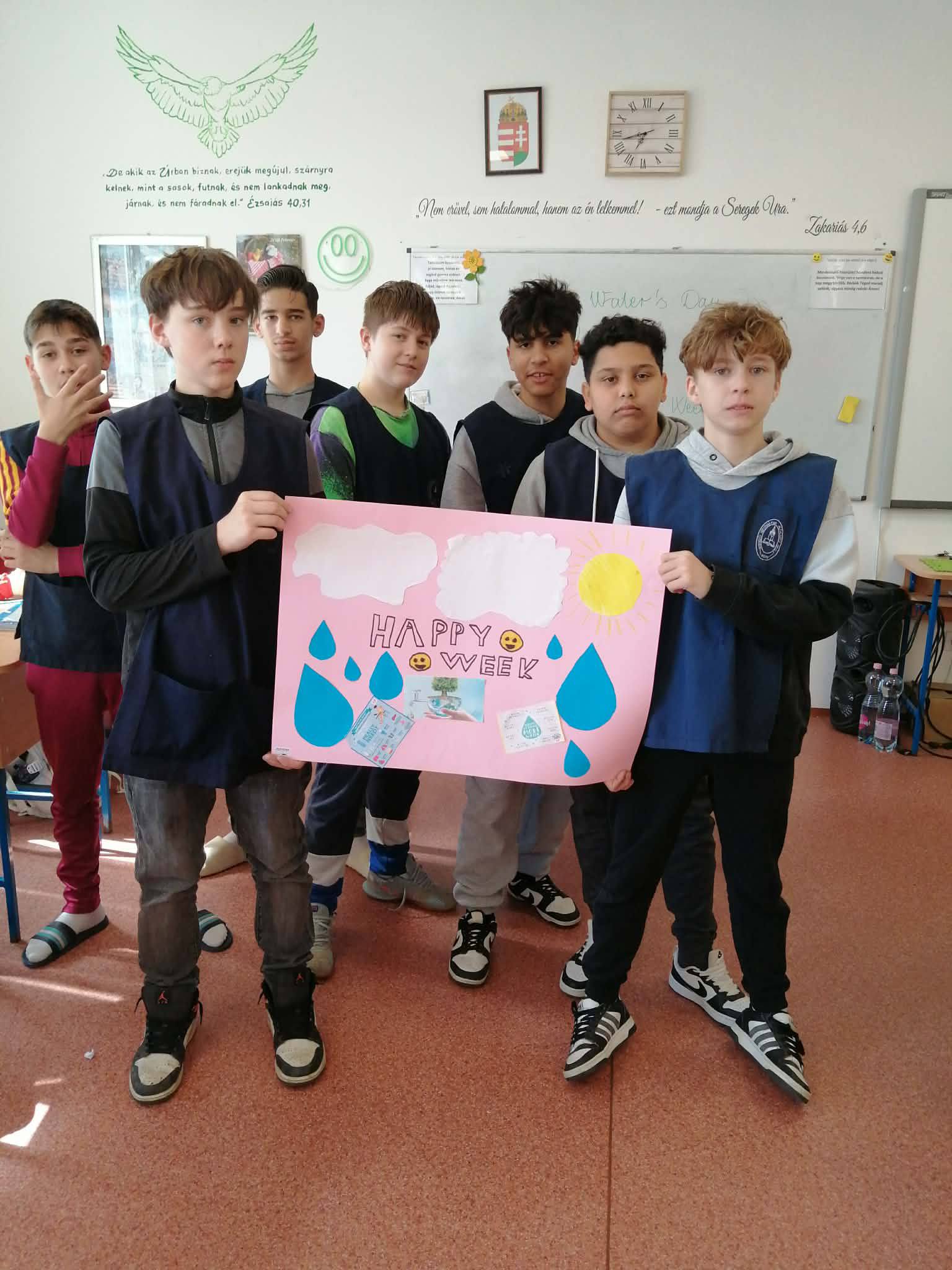 "Aki szomjazik, jöjjön! Aki akarja, vegye az élet vizét ingyen!" Jelenések 22,17 A héten Happy hetet tartottunk az iskolában! Célunk, hogy a vízivást népszerűsítsük intézményünkben, erre pedig több, kreatív feladatot és módszert is bevetettünk. Nagyon fontos, hiszen a gyerekeknél elterjedt a cukrozott üdítőitalok fogyasztása. Digitális feladatokkal, játékos testnevelés órákkal, vízbárral, óra közbeni ivással próbáltuk felhívni a vízivás gyakoriságának fontosságára a diákok figyelmét. Utolsó napon a víz világnapjával egybekapcsolva iskolánk udvarán élő hullámot alkottunk, valamint rajzkiállítást rendeztünk folyosónkon.