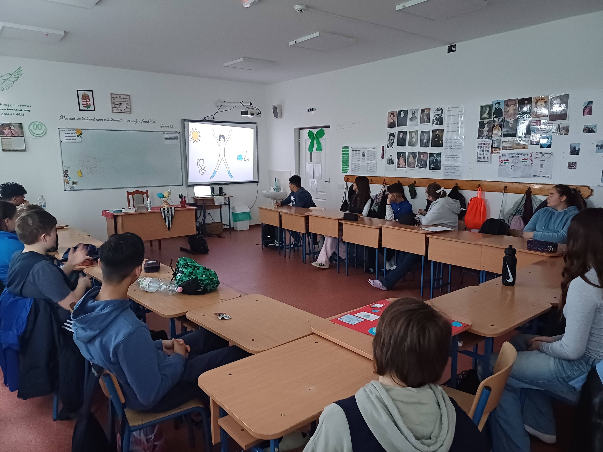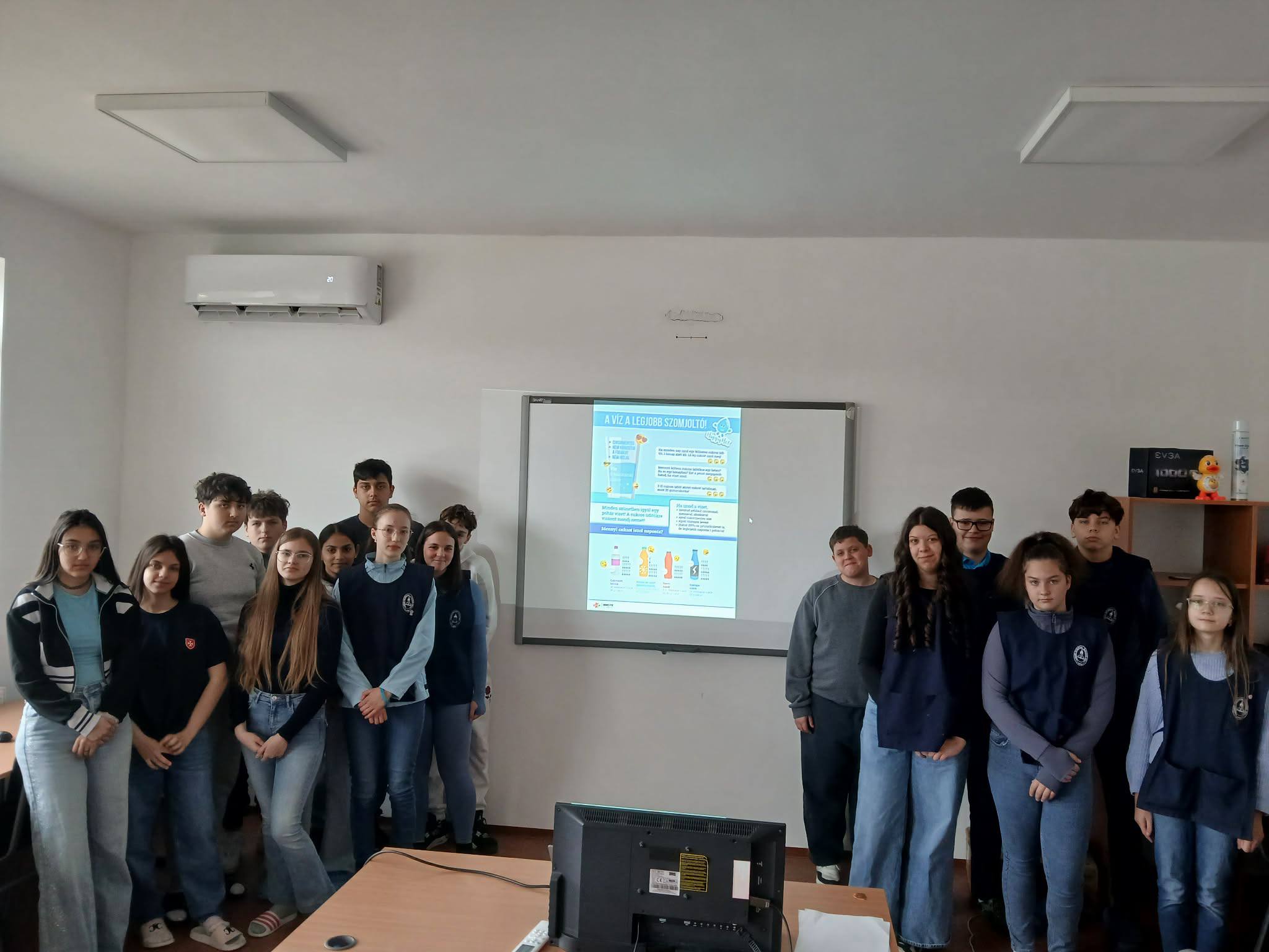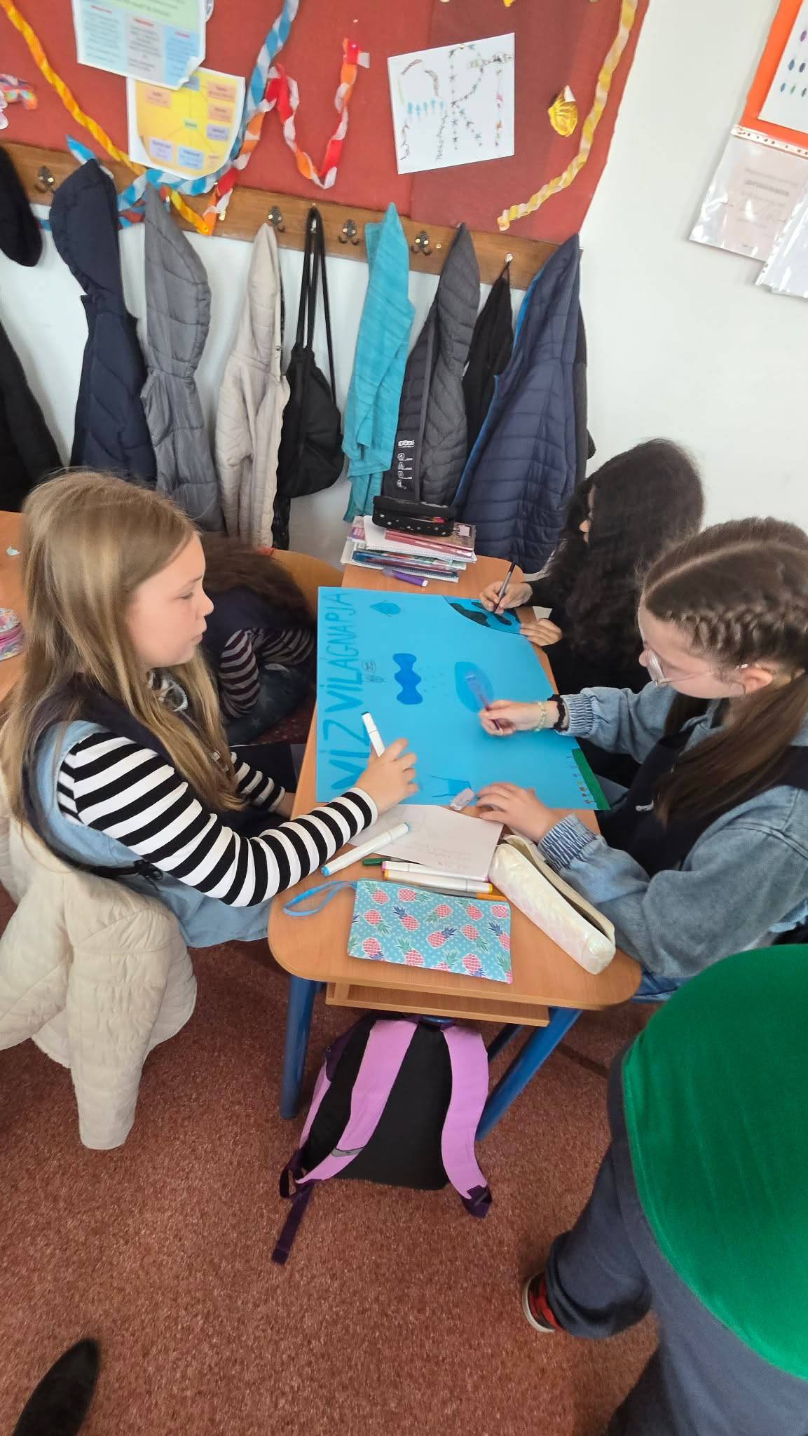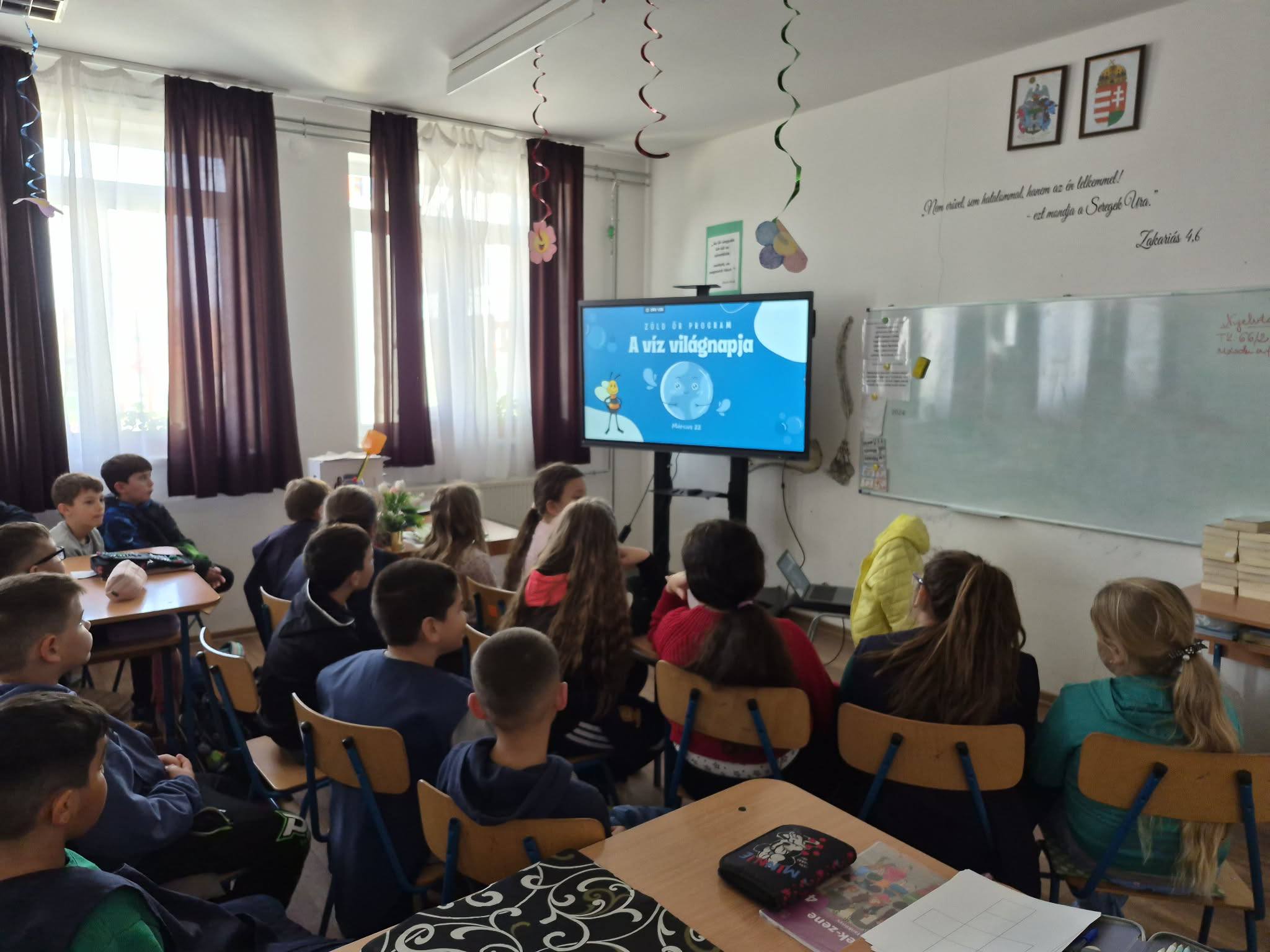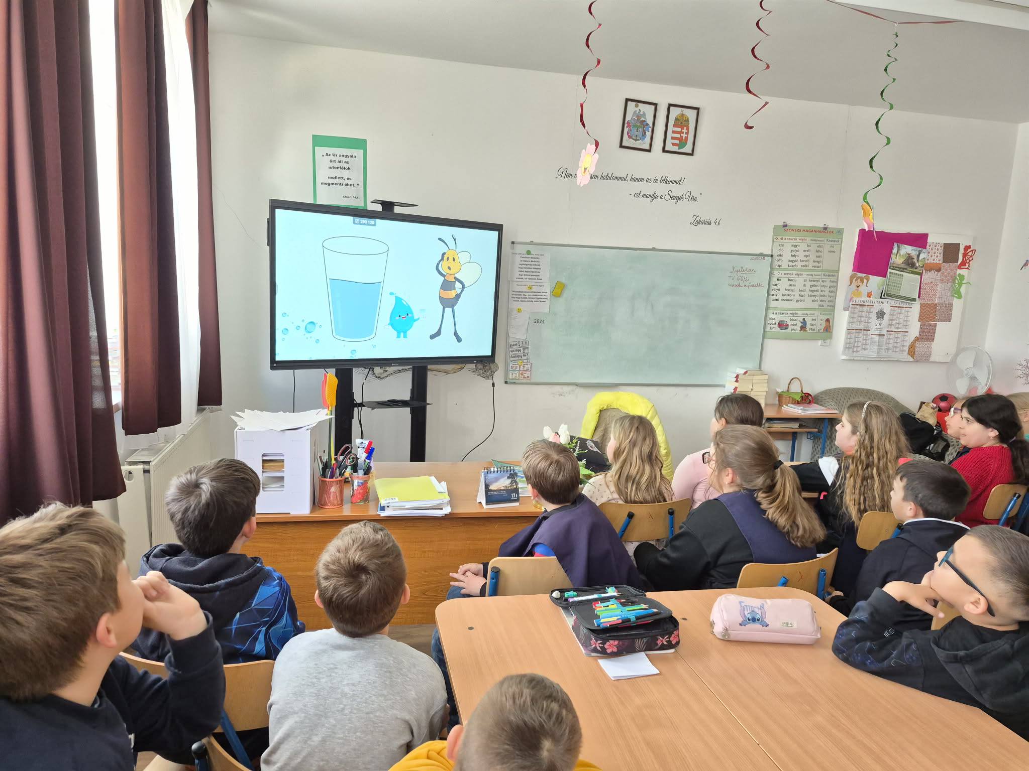 "Aki szomjazik, jöjjön! Aki akarja, vegye az élet vizét ingyen!" Jelenések 22,17 A héten Happy hetet tartottunk az iskolában! Célunk, hogy a vízivást népszerűsítsük intézményünkben, erre pedig több, kreatív feladatot és módszert is bevetettünk. Nagyon fontos, hiszen a gyerekeknél elterjedt a cukrozott üdítőitalok fogyasztása. Digitális feladatokkal, játékos testnevelés órákkal, vízbárral, óra közbeni ivással próbáltuk felhívni a vízivás gyakoriságának fontosságára a diákok figyelmét. Utolsó napon a víz világnapjával egybekapcsolva iskolánk udvarán élő hullámot alkottunk, valamint rajzkiállítást rendeztünk folyosónkon.