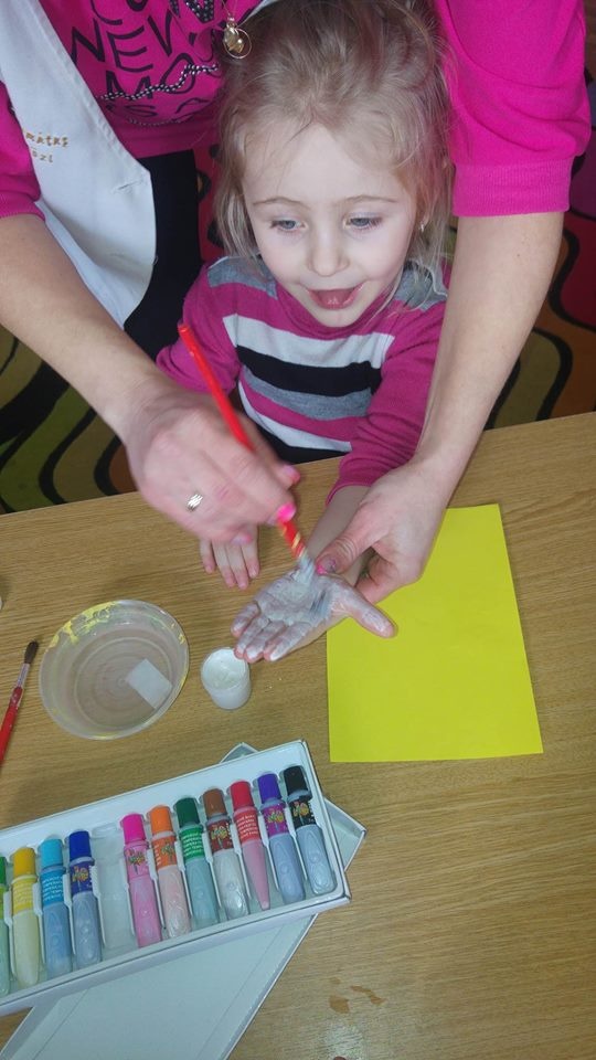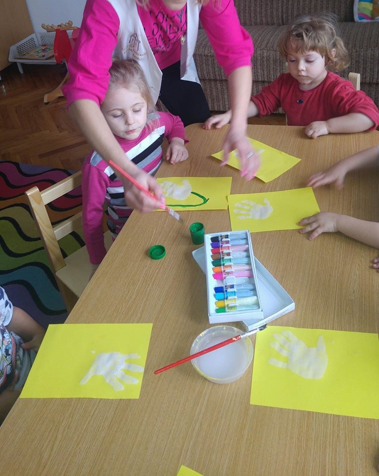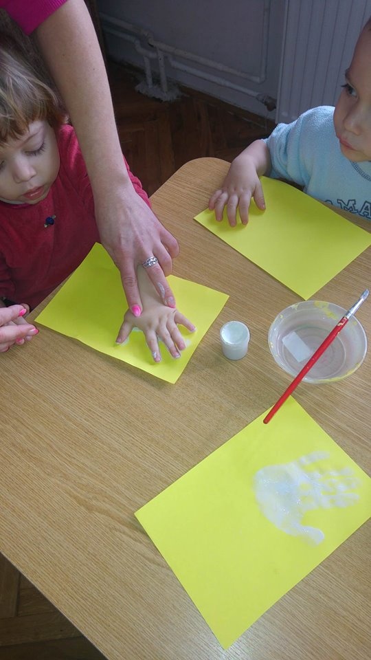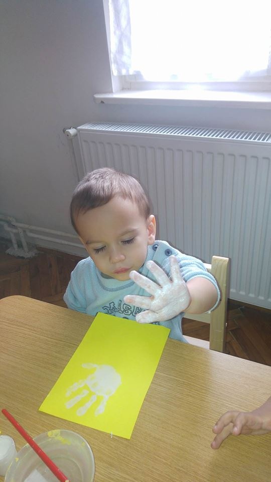 A kicsik kézügyessége, "kézlenyomata" is egyre jobban fejldőik. Közeledik a tavasz, így készítettek egy hóvirágot, méghozzá úgy, hogy a befestékezett kezükkel egy lenyomatot hagytak a papíron, ami így a virág szirma is lett egyben.